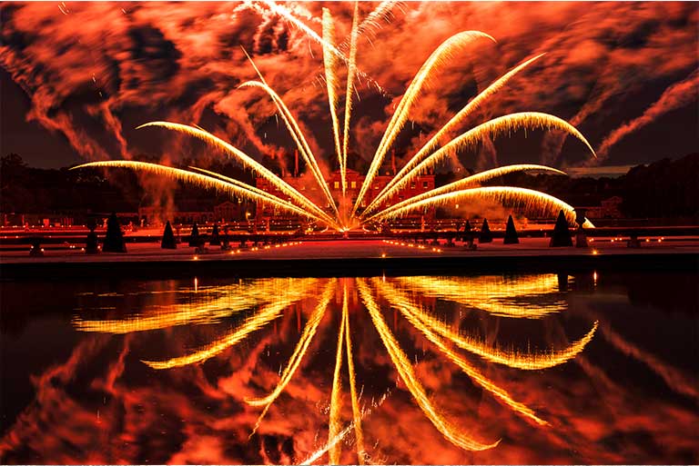 Bottom Left: Photo by Diane Cook and Len Jenshel, MAINCY, FRANCE on view in the SPECTACLE Exhibition. Evoking France’s grand siècle (great century), the Chateau de Vaux-le-Vicomte blushes with a crimson glow as a semicircle of fireworks arc across the garden and reflects in the pool below.